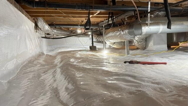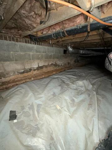 The basement of this 100-year-old home had a water intrusion problem. As a result, mold grew, humidity levels rose, and insulation fell. The crew installed a drainage system and CleanSpace vapor barrier to prevent water from entering through the walls or dirt ground. In addition, they installed a SuperSump Pump and a SaniDry Sedona dehumidifier to ensure water is pumped out of the basement and humidity levels remain low.