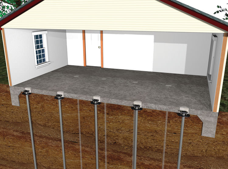 Foundation slab piers are straight steel piers that extend from stable soils deep below the structure to support brackets directly in contact with the underside of the slab. These piers are meant to support a settling concrete floor, and are not appropriate for foundation wall stabilization.