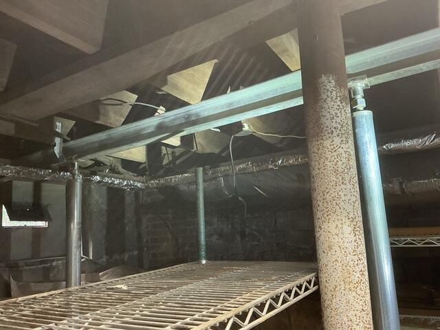 Our production team executed the plan with precision. First, we laid engineered fill to create a solid base in addressing the weak foundation soils. We then placed galvanized steel columns on a 12-inch steel base, connecting them with adjustable brackets to the existing girders for optimal support. Utilizing heavy-duty threaded rods, our team meticulously adjusted the system to lift the sagging floors and effectively reduce the floor bounce.