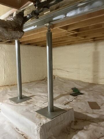 Our skilled production team arrived at the home ready to implement the solution. Initiating the process, they set durable 12-inch steel bases beneath the crawl space. With precision, galvanized steel columns were customized to appropriate lengths and affixed with adjustable top brackets. These elements effectively addressed the issue of weak foundation soils by evenly distributing the home’s weight, achieving optimal stabilization. The use of heavy-duty threaded rods allowed for precise adjustments, aiming to restore the floors above the crawl space to their original elevation. Post-installation, the meticulous work resulted in considerable improvement, significantly reducing floor bounce and ultimately enhancing the homeowner's peace of mind.